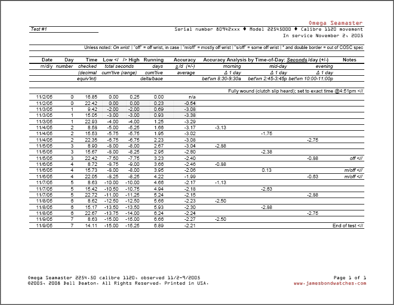 year. In total, 7 days were observed. This model watch was never worn in a James Bond movie. However, it shares the same Omega calibre 1120 movement (which is fundamentally what we're assessing in these trackings) as is found in the Omega 2531.80 reference Seamaster. The link below provides complete access to this report and data. Note that for any given minute tracked, the second-hand position deviated by as much as one-quarter of a second, revolution after revolution, depending on its position relative to the dial. In other words, this watch could be observed as exactly matching the USNO Master Clock with the second-hand pointing at one number on its dial, and be 0.25 seconds slow (or fast) as it traveled through another position, then exactly matching again as it passed the initial point cited. |